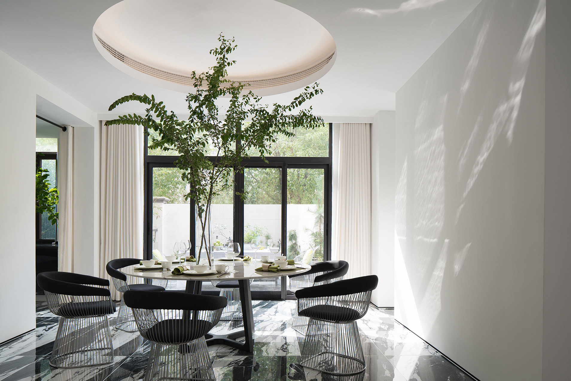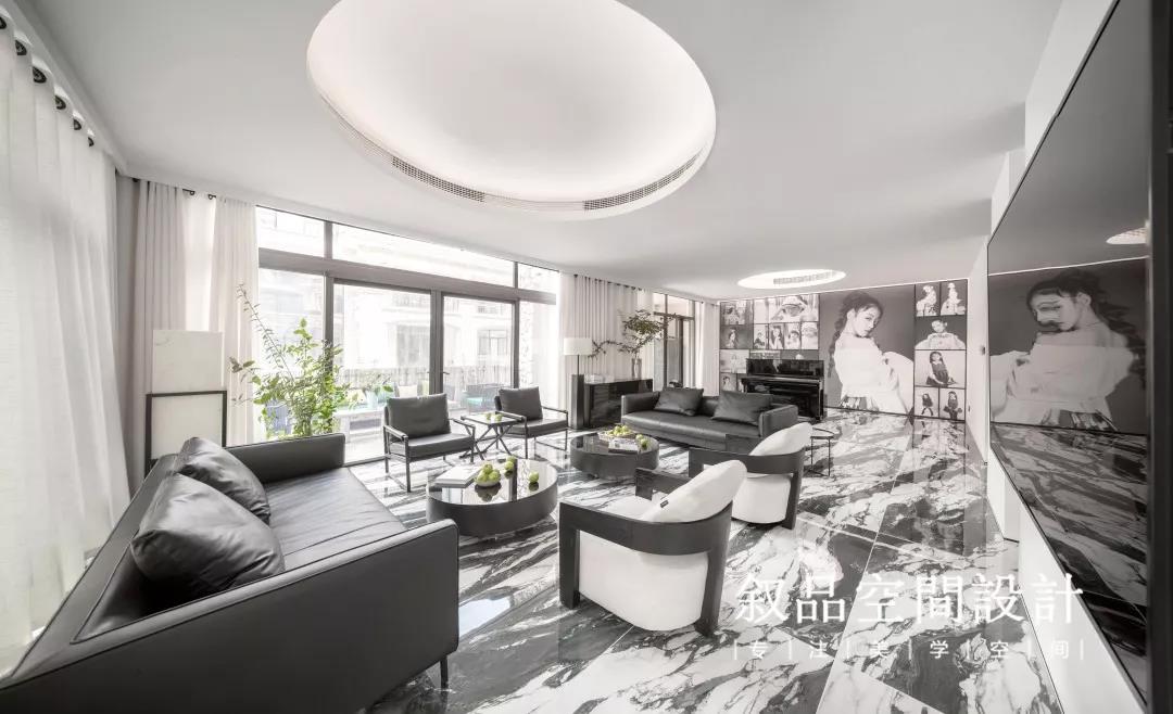 客廳及主要房間地面都采用水墨畫瓷磚,用簡潔現代的手法表現中國山水元素,典雅卻不古板。客廳大幅海報照片墻記錄成長的點滴記憶,造型簡約的黑色桌椅,頗具張力的雕塑和黑色鋼琴,帶來強烈的藝術氣息。