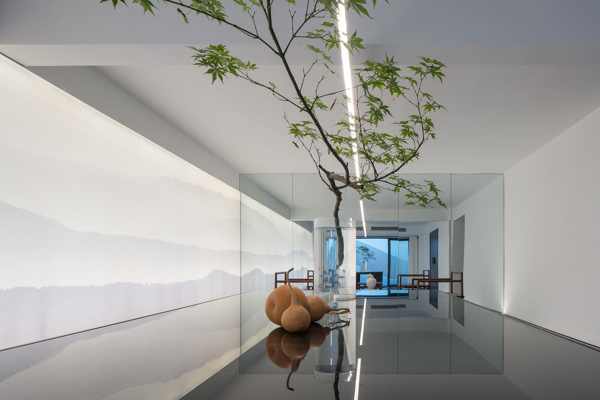 一泊古船、一汪水景與一叢草木,茶室中古樸禪意與現代材質玻璃磚墻面的碰撞,逸趣橫生。快意人生,不僅有美酒,更要有好茶。對于鐘愛江南文化的設計師來說,山水畫和品茗意境最是相得益彰,有此背景的山水燈膜為品茗多添了幾分意境。
