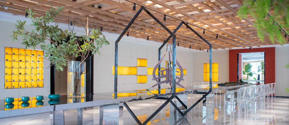 茶展廳:鋁方通頂面在鏡面不銹鋼桌面的反射下,與倒影產(chǎn)生一種奇妙的對(duì)話。呈矩陣排列、視野開闊通透的展廳,為匠心出品的茶具和上好茶葉提供充分的展示環(huán)境。