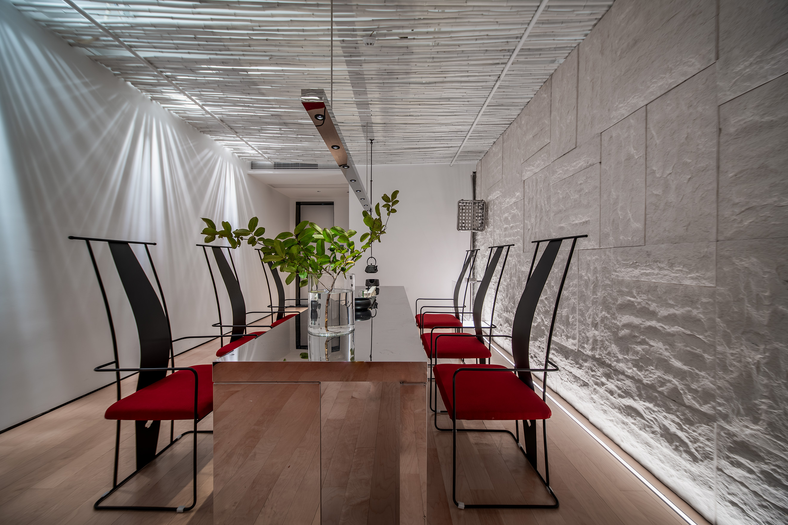 茶室/包廂:白砂巖背景墻富含肌理,頂面以細(xì)竹噴白漆,純粹自然的色調(diào),粗獷與細(xì)膩的碰撞。以當(dāng)?shù)刂窈t為原型設(shè)計(jì)的鐵藝裝置,充滿藝術(shù)氣息。玻璃磚隔斷隱約朦朧,于喧囂鬧市中勾勒出品茗小聚的私密氛圍。