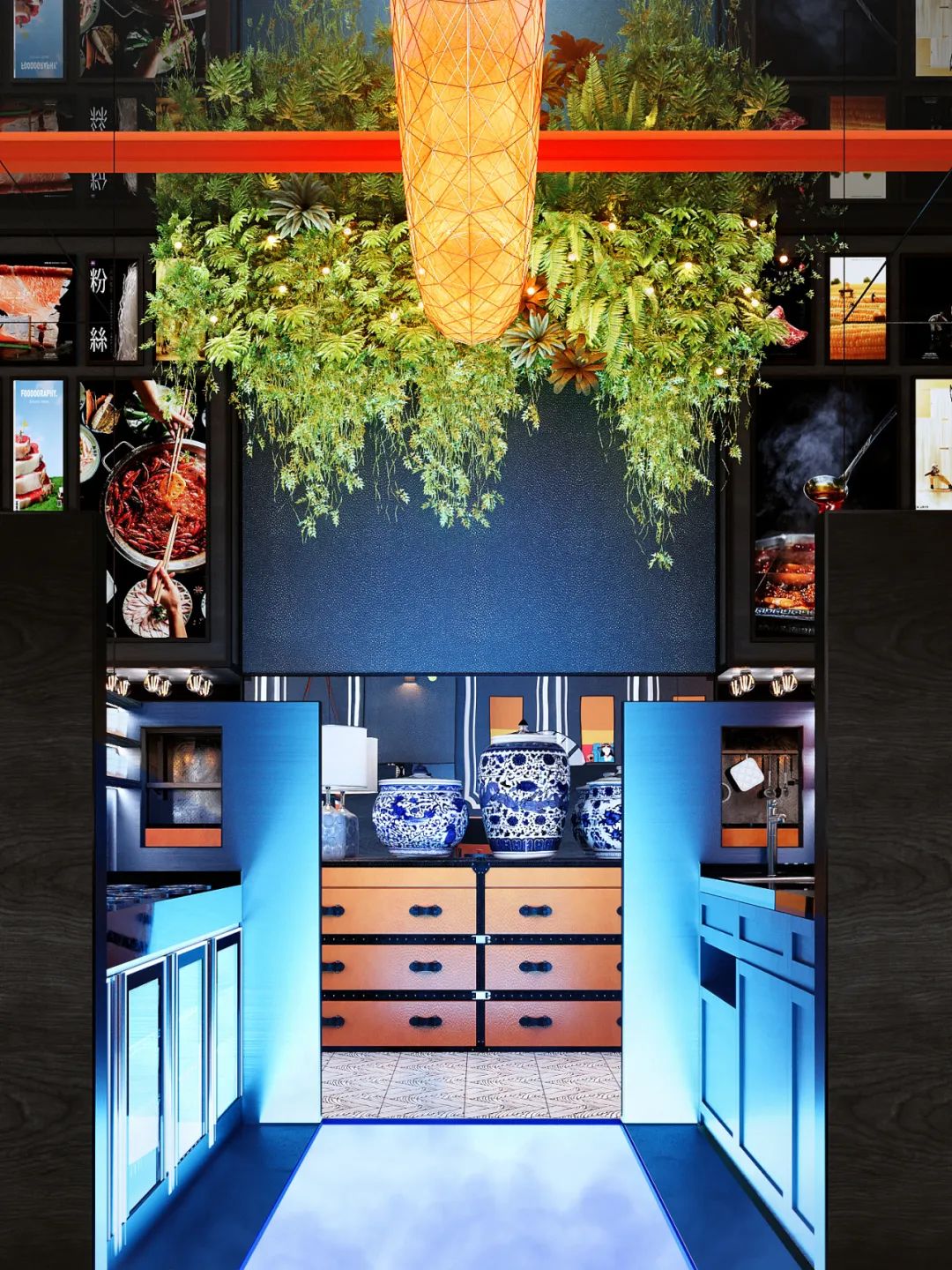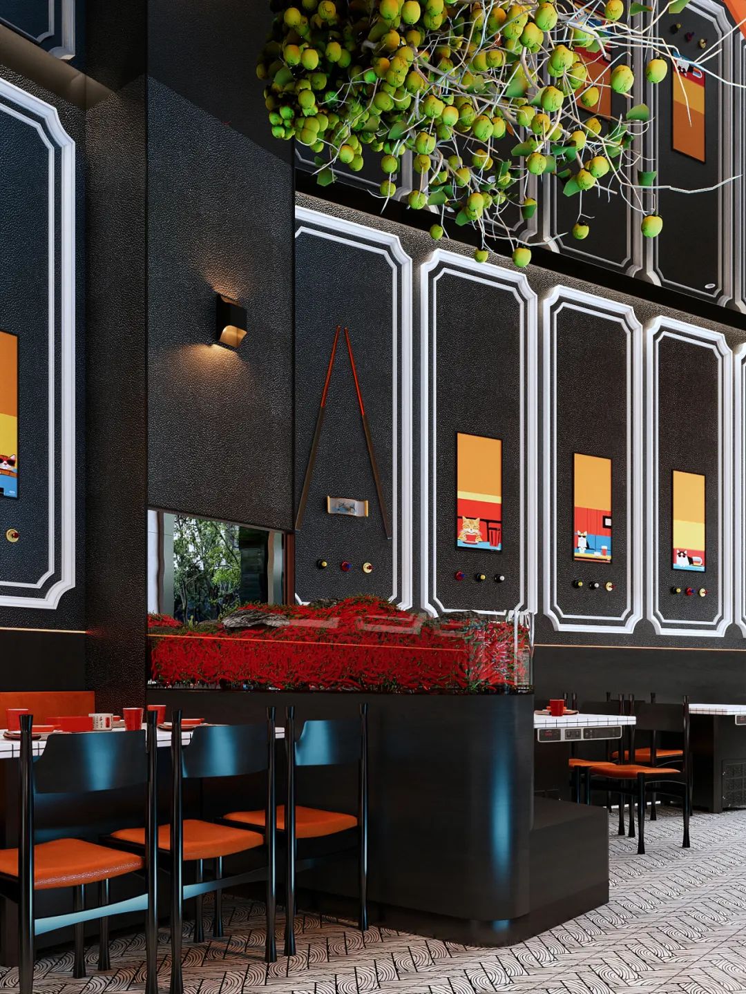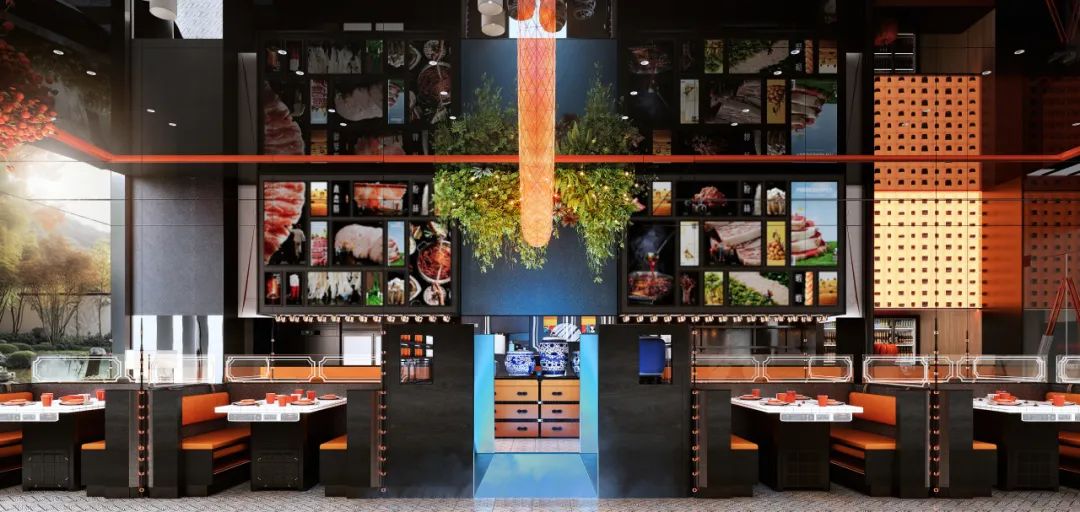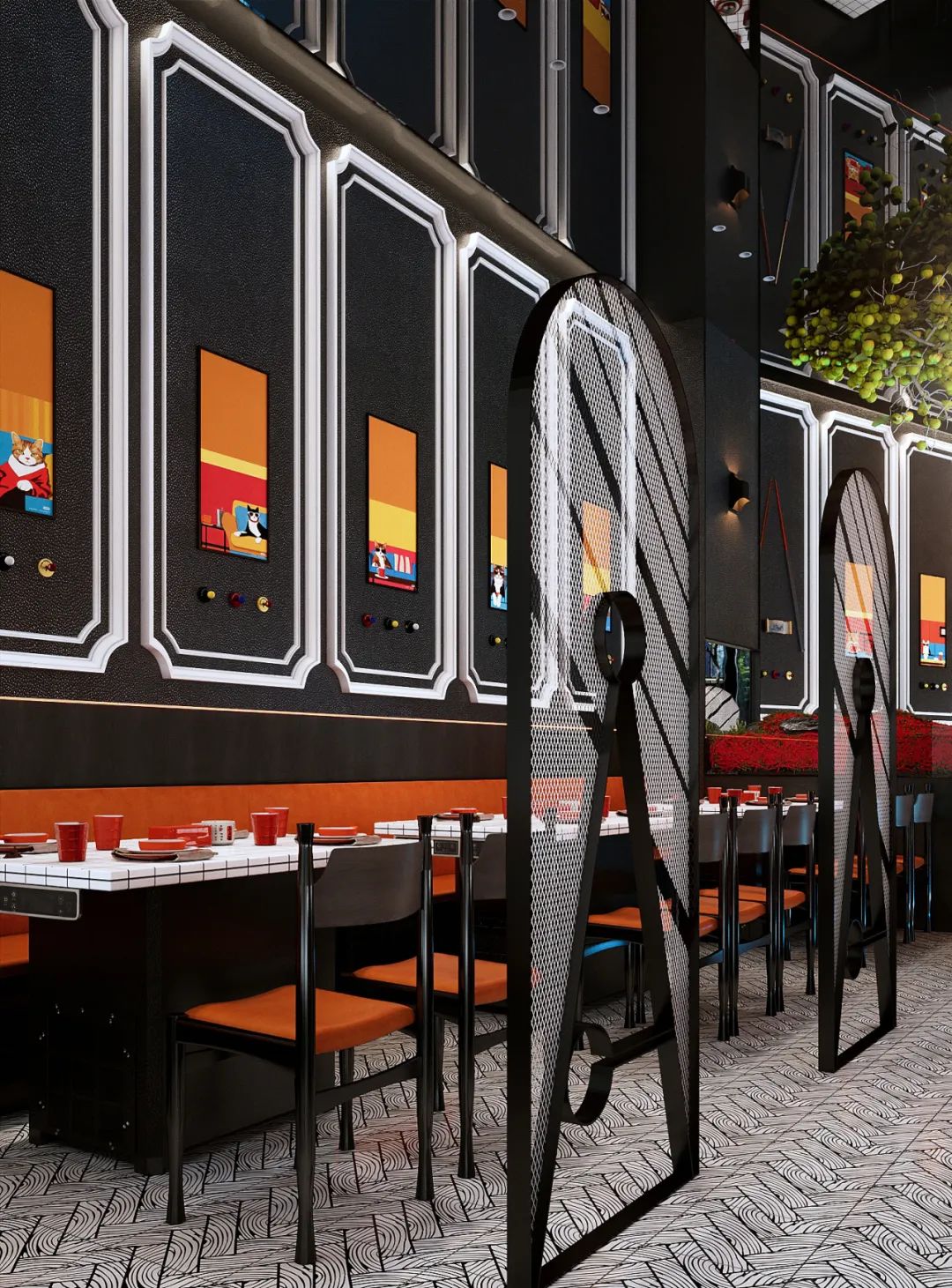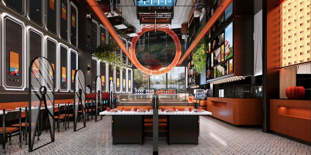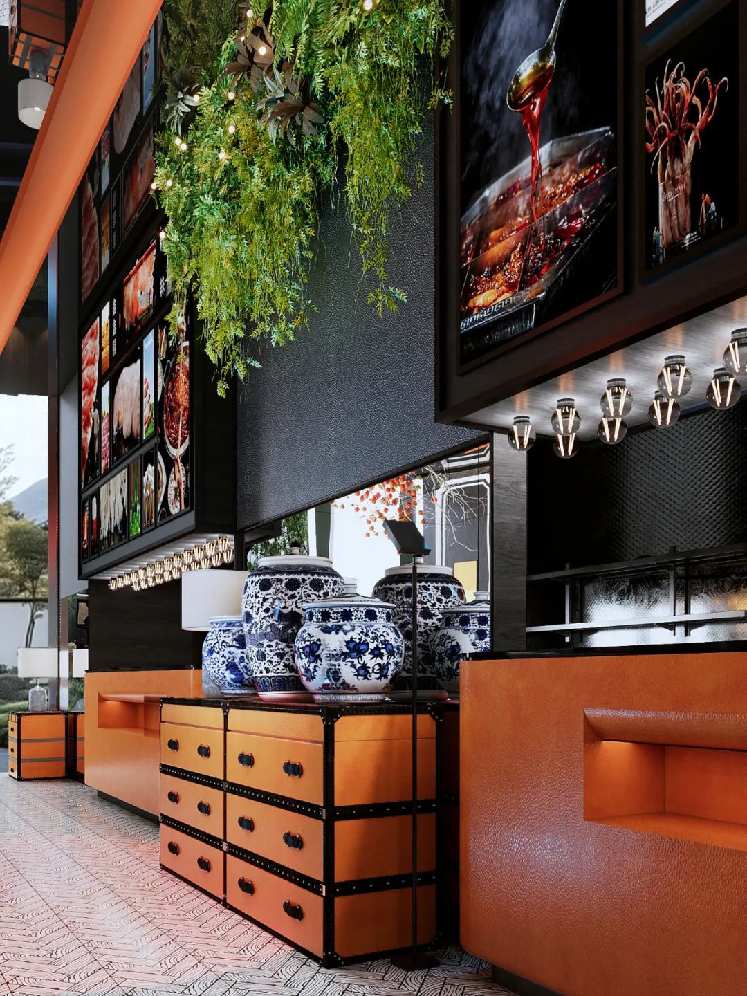 空間通過(guò)主材不銹鋼與珍珠皮革的結(jié)合構(gòu)建一個(gè)兼具克制與爆發(fā)力的沉浸式火鍋體驗(yàn)場(chǎng)域。橙色藝術(shù)裝置燈搭配局部橙色線性光帶,模擬火鍋沸騰時(shí)的光影躍動(dòng),激發(fā)食欲與社交欲。