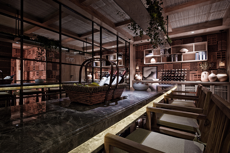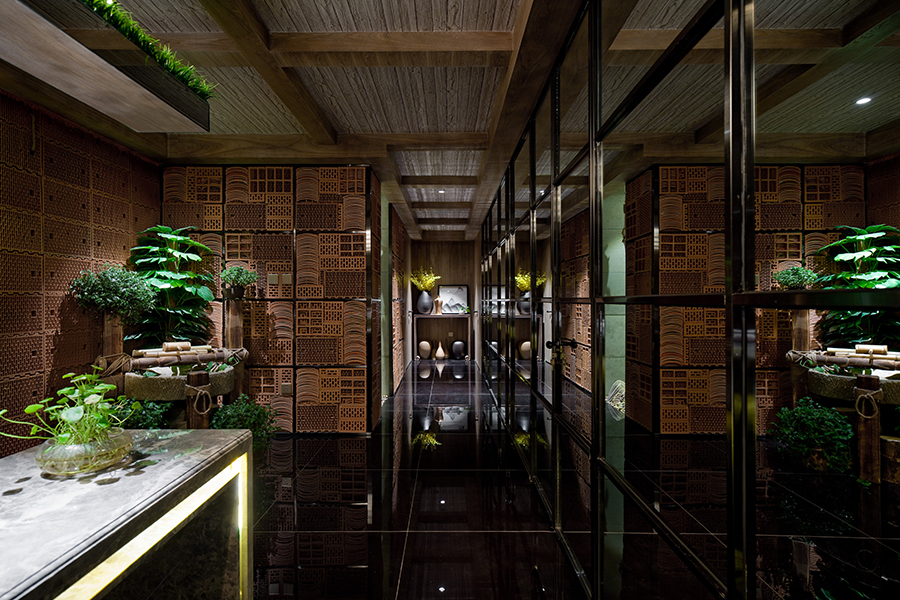 入門的四周墻面都是紅色的小磚,瓦片錯疊拼接,中間用黑色的拉絲不銹鋼線條分割,精致又有點古老的味道。地面是黑色的光面磚,像是一片黑色的海洋,倒映著暗紅色的墻面,空間顯得干凈溫暖。