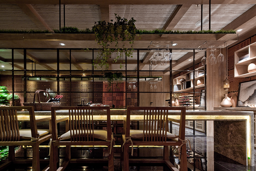 吧臺后面用鏡子和黑色不銹鋼條做成寬窄不一的格子,跟紅色的磚墻形式一樣,用鏡子拓展不寬敞的空間,使空間顯得更有深度。