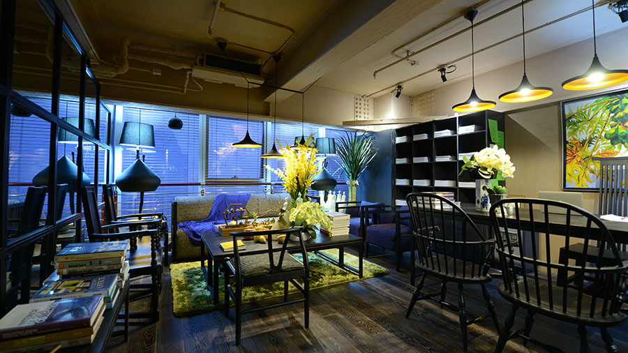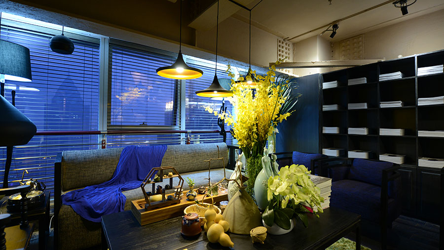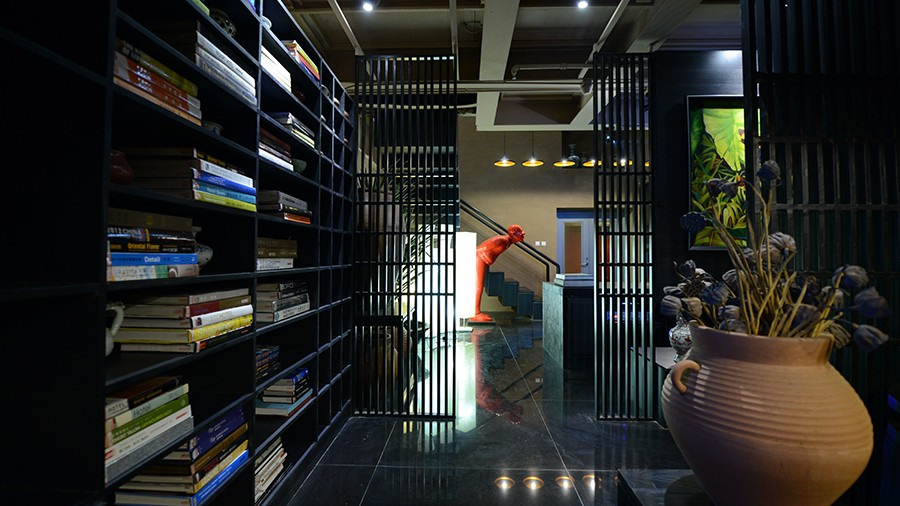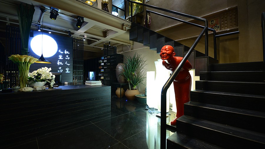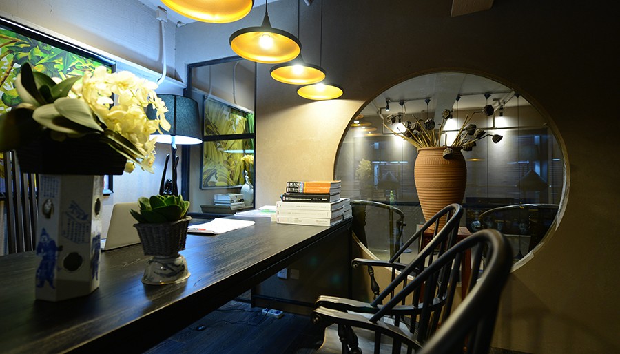二樓主要創造了一個鏡像空間。鏡子和鐵絲網材質的給人特別的感受,將鏡子反射的特點運用在隔斷上,使本來很小的空間看的更加的寬廣,更有意境。二樓集合了設計師辦公、會議、會客這些功能。會客酒吧區既可以一邊品酒喝茶又營造了舒適的交談氛圍。從樓梯上去,兩把中式圈椅擺在過道邊上,立馬讓人產生一種東方禪意的韻味。設計師辦公室的圓窗的設計,主要借鑒了園林的透景的設計手法。