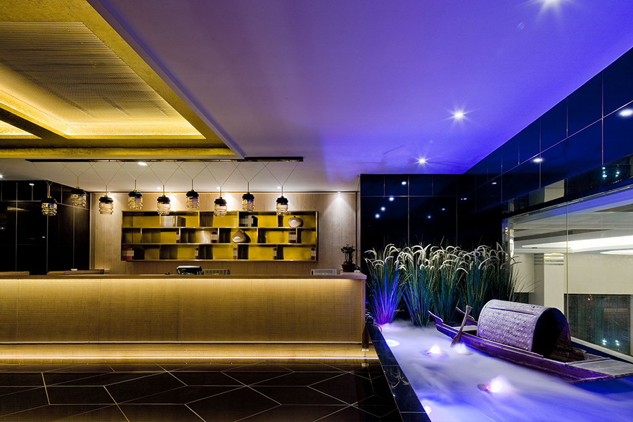 吧臺銅板面中暗藏的燈帶,將吧臺照亮。