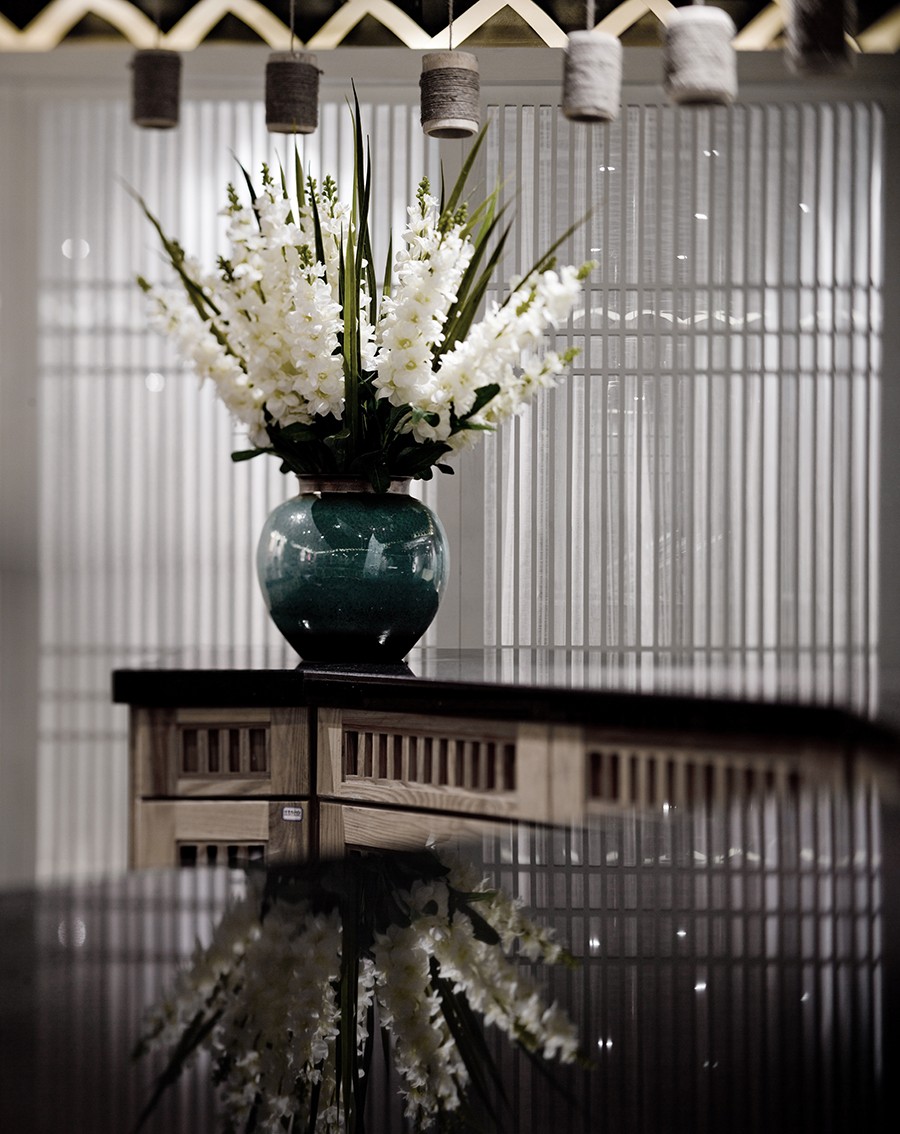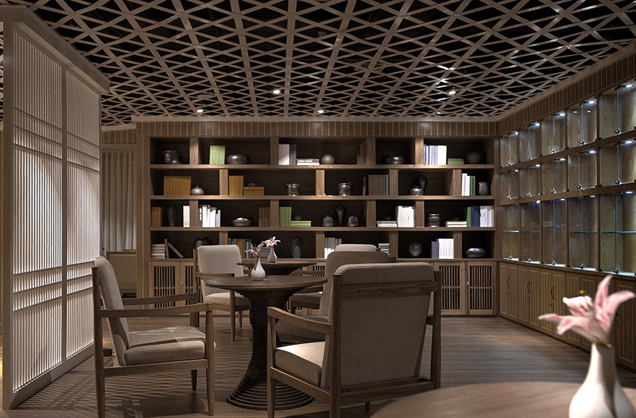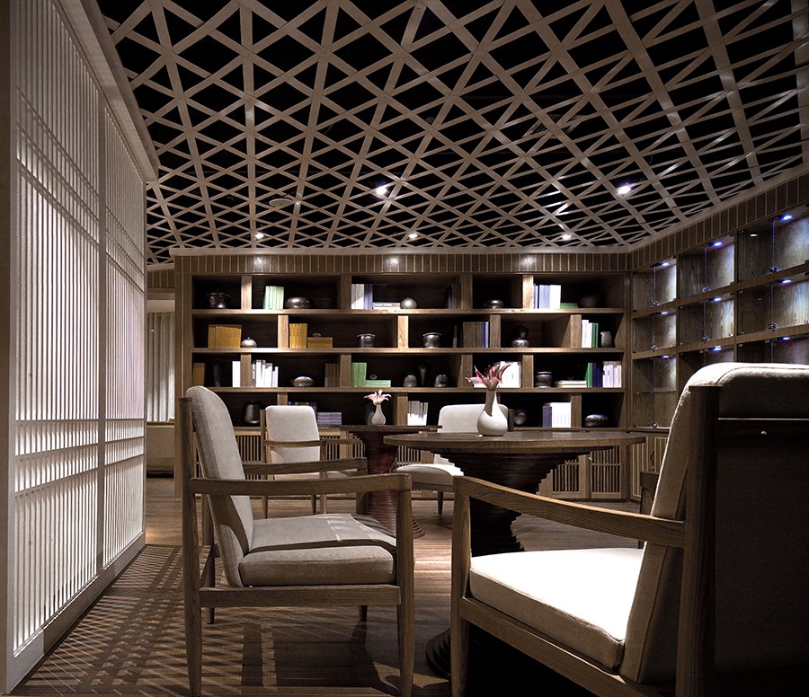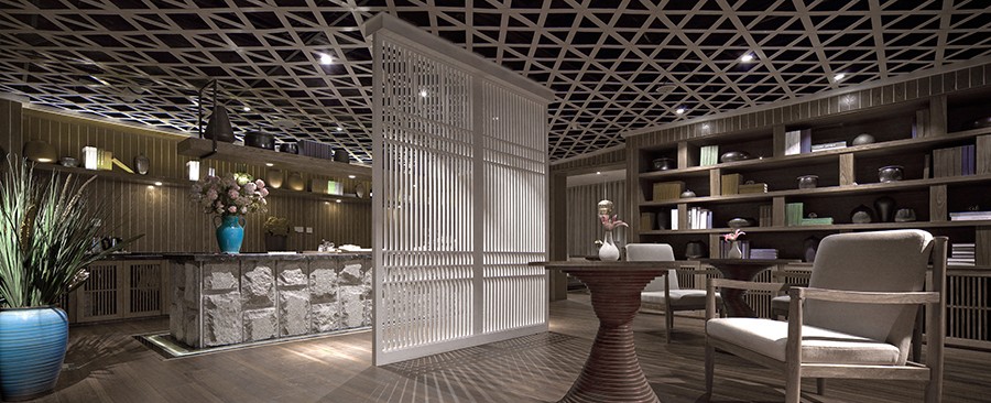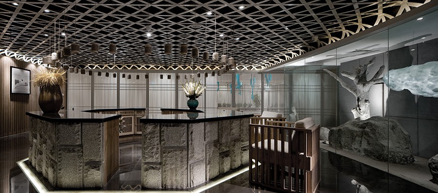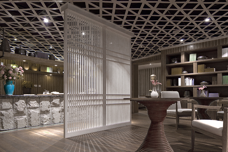 主入口的小景觀,地上是一塊大大的石頭,未經雕琢,石頭背后是一棵白色的枯木,頂上飄著輕輕的一片云,透露著簡單又純凈的自然氣息。走進去是原石做的接待臺,石頭棱角分明,和周圍的木色相互襯托,這種寧靜讓從喧囂世界走進來的我們瞬間安靜了下來。透過木格子可以看到休息區,幾個小圓桌,原木色的椅子,等待的客人坐在那安靜的看看書,低聲閑聊。