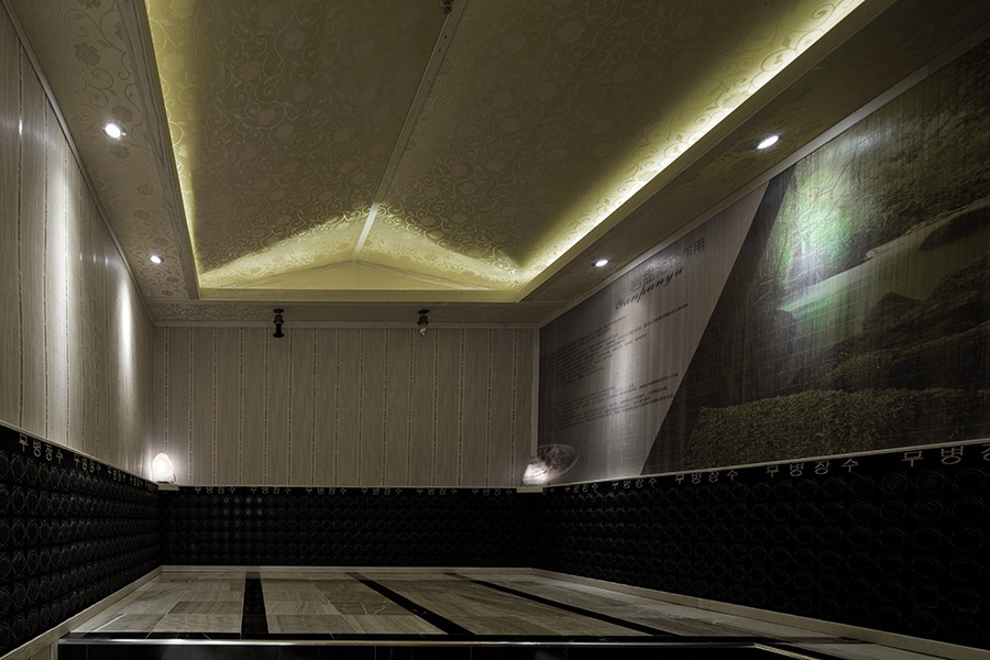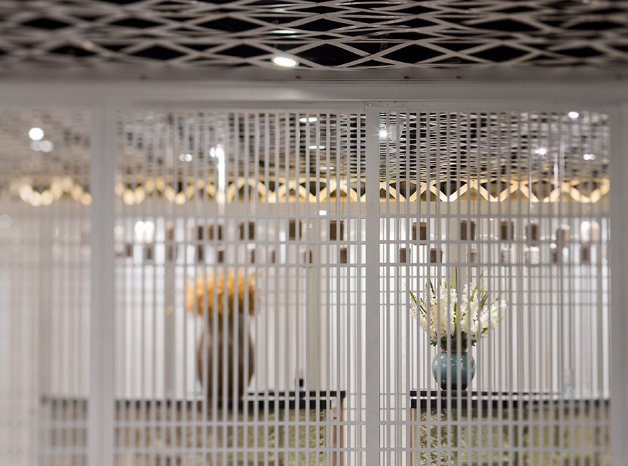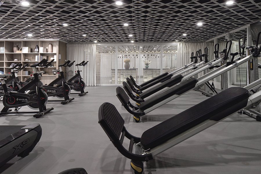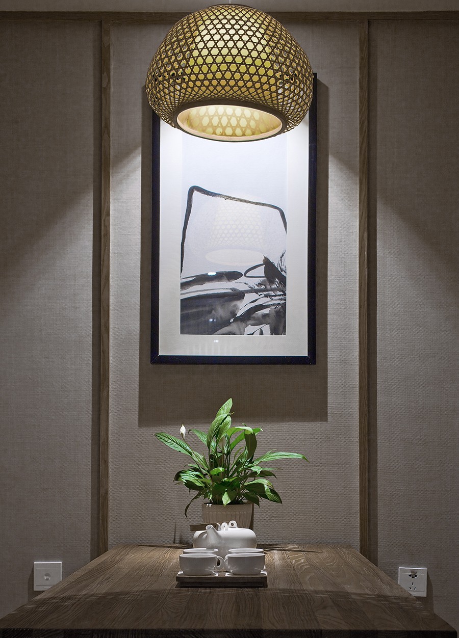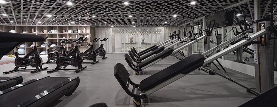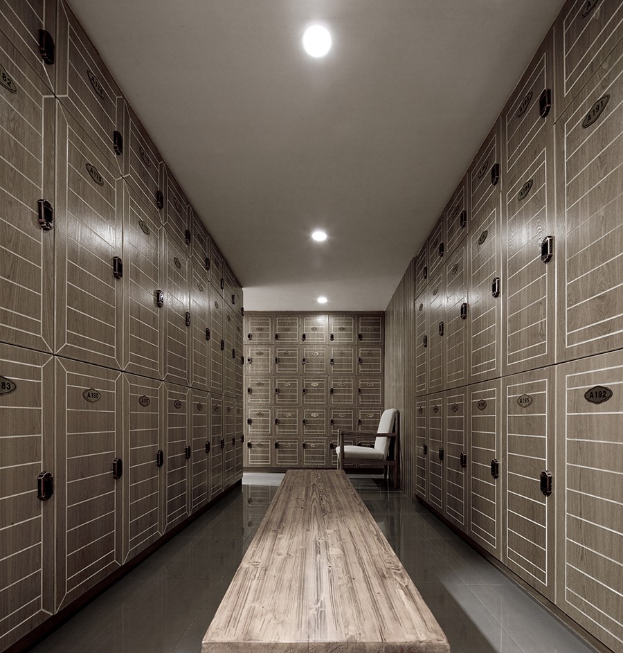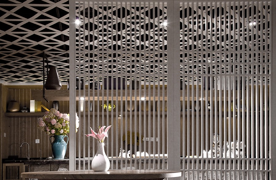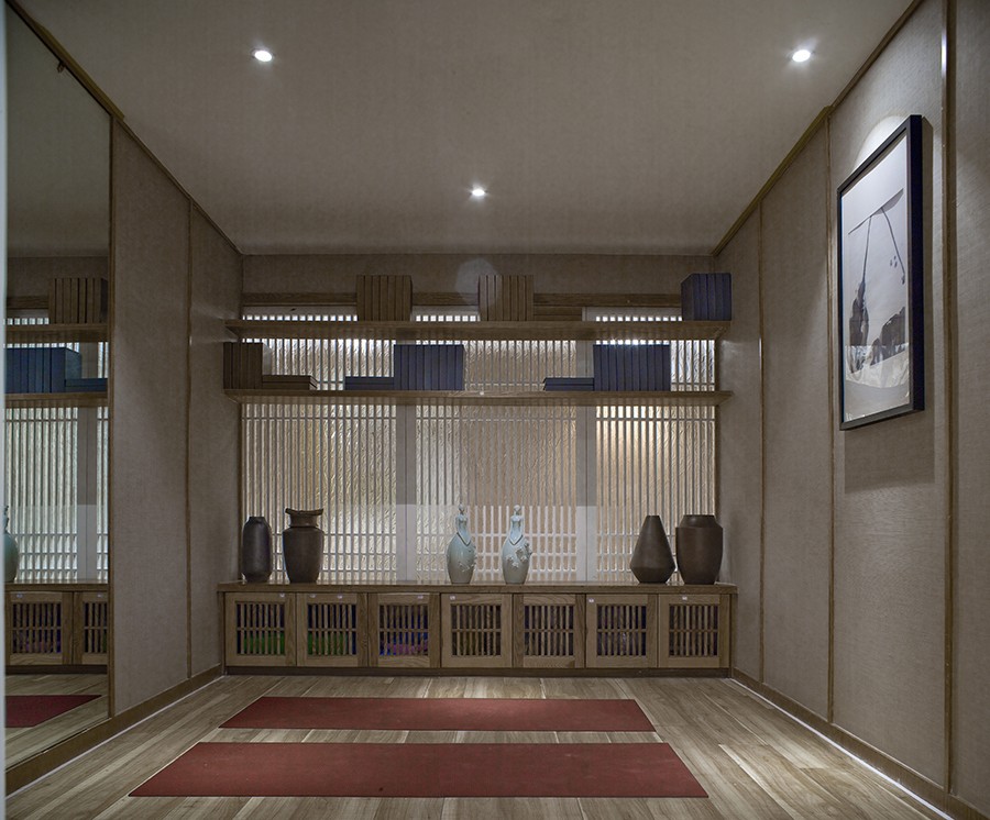 吧臺區和接待臺一樣用了原石和銹鐵板,天花上也是很巧妙的用了白色的鏤空鐵片,做成高低起伏的造型,像是瑜伽給人的那種柔美的力量。從天花吊下來幾只小小的裝飾竹子。四周都是木作的隔斷,布紋玻璃背后透著淺淺的燈光,讓后面的空間給人一種神秘感。很想輕輕推開門看個究竟。