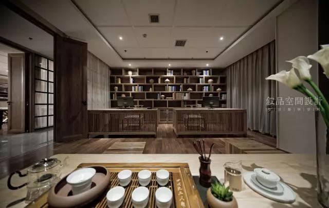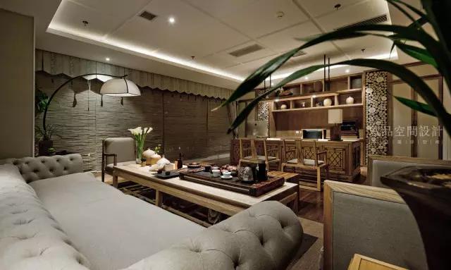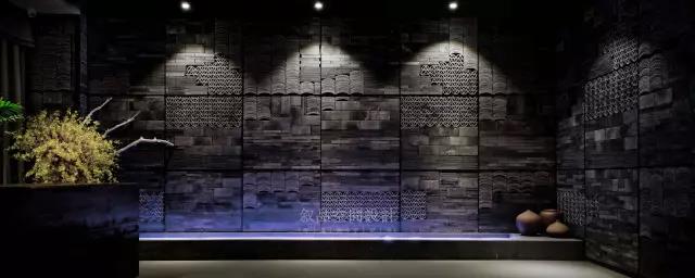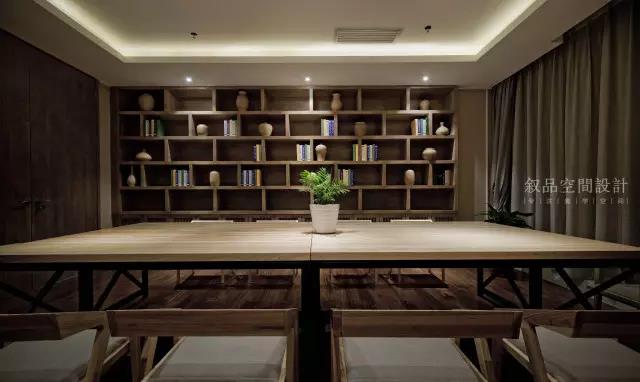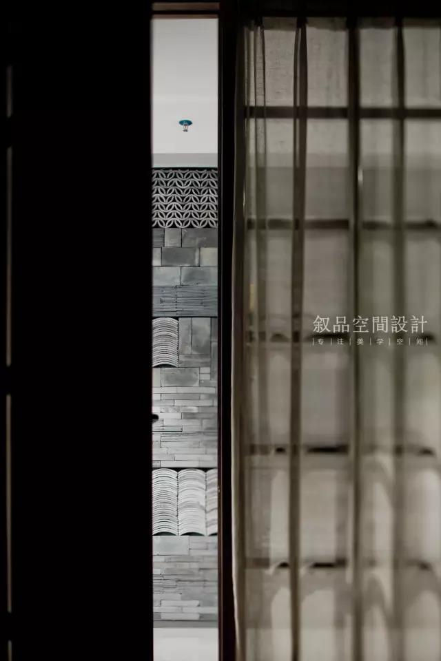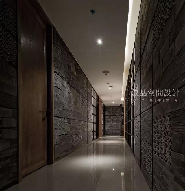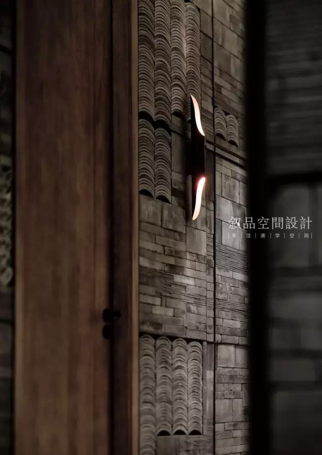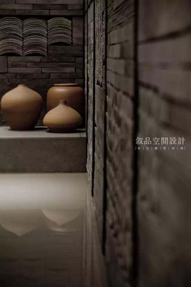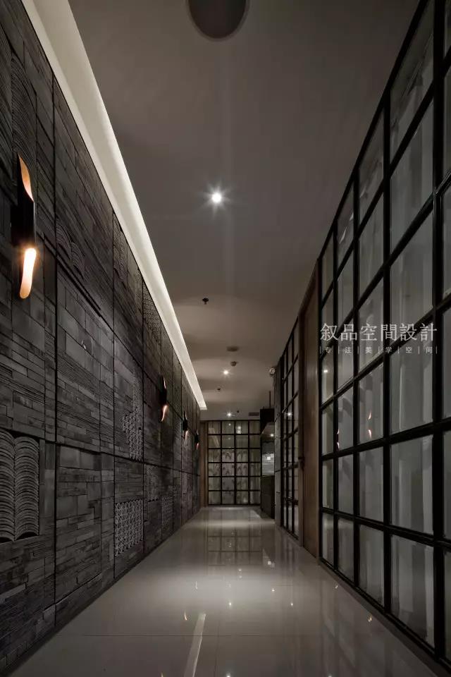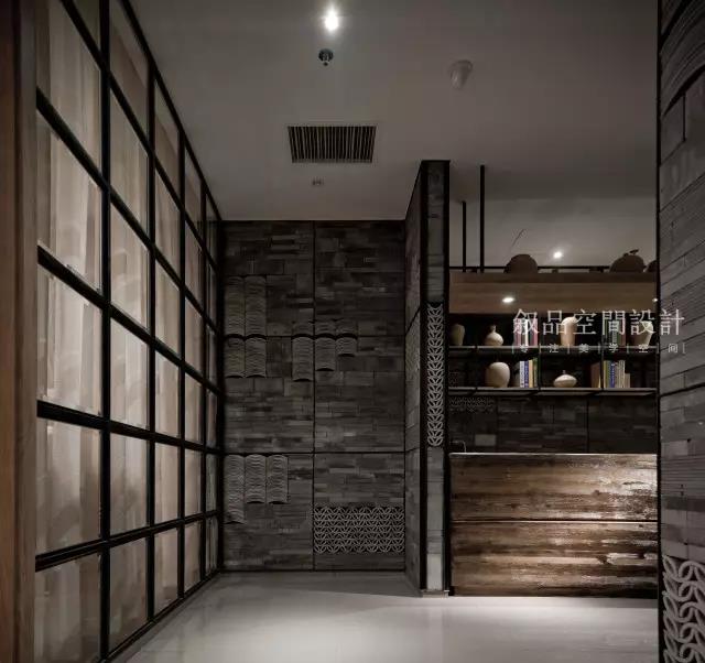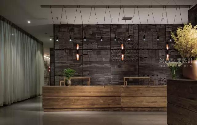 本案入門可見原木色粗狂的飾面接待臺,原木質地粗糙,凸顯個性。背面黑色木作線條,整潔有序的排列將自然而古樸的粗狂瓦片圍合,石材的冰冷加上原木的柔和,紋路細膩與粗野的搭配,剛與柔的結合,狂野中帶著柔美。角落擺置著檸檬黃色的跳舞蘭,無形中增添一分活力。
