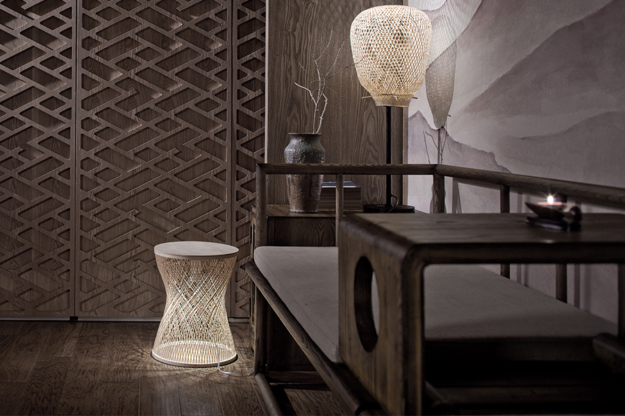 內凹的壁龕在燈光的照射下發出淡黃色的光,其他三面墻均以木格作為裝飾,斯文又透氣。