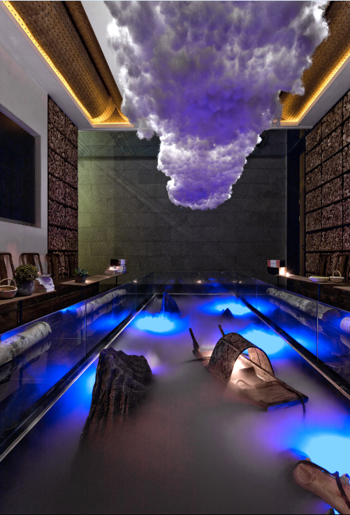 等待區的中間規劃了一處水景,有山有水還有小船,頂面還飄著一處云彩,這樣的空間使人想靜不下來都難。