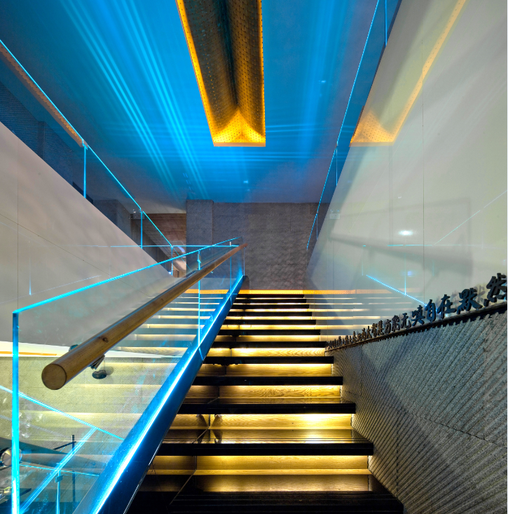 二樓走道采用了木拼條的造型,墻頂結合,地面采用了亮面的黑色地磚。