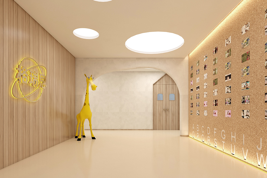 空間整體采用溫馨的木色,從木屋形態(tài)的壁龕,洞穴門到交錯(cuò)分布的圓形吊頂,這個(gè)“森林星空”童趣十足。墻面主材是以環(huán)保著稱的白色馬來(lái)漆與生態(tài)板,為孩子們營(yíng)造安全環(huán)保的活動(dòng)環(huán)境。