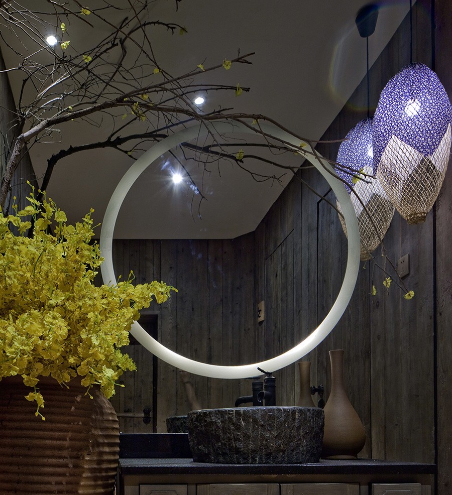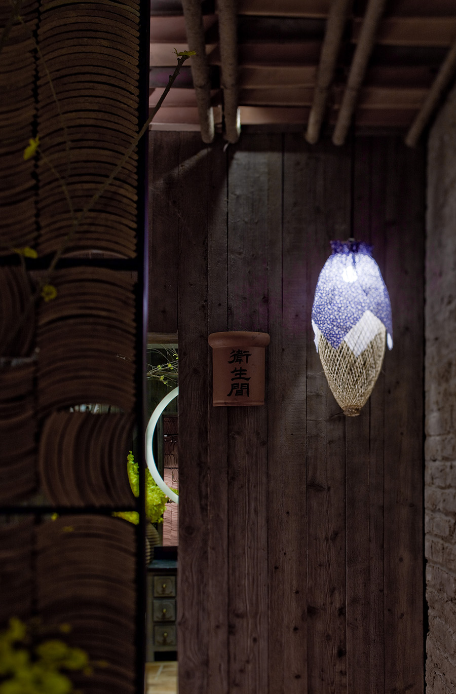 洗手間用了紅色的古磚,原木色的洗手臺,邊上是一棵白色的枯木,跟鏡前的小吊燈組成了一副古詩里的場景。衛生間過道用的是寬窄不一的原木板,巧妙地把包間的門隱藏在一面墻里。每個包間的門上都有一盞用瓦片做成的小壁燈。