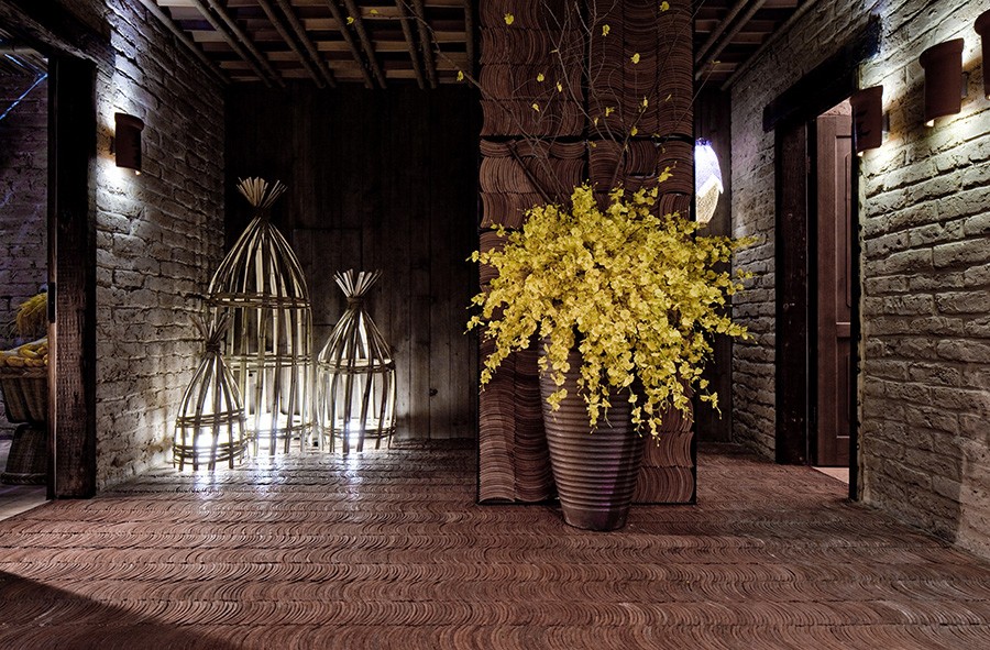 入門是一道長長的竹林景觀,古人言:“寧可食無肉,不可居無竹”。竹子是最能體現文人環境的植物。過道的竹林是細細的枯竹,燈光從后面的墻上透過竹林散發到地面上,而細看地面,竟是一片片紅色的古瓦,豎著密密的排列,仿佛走進了古人的居所。