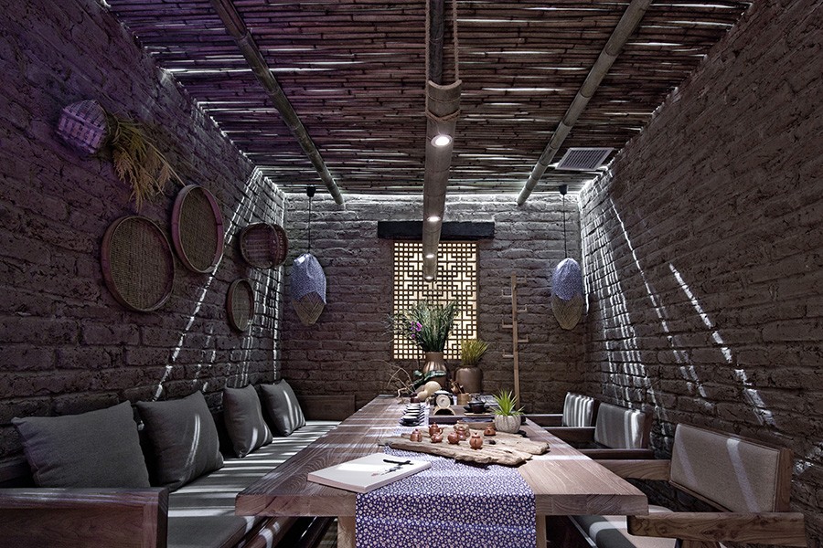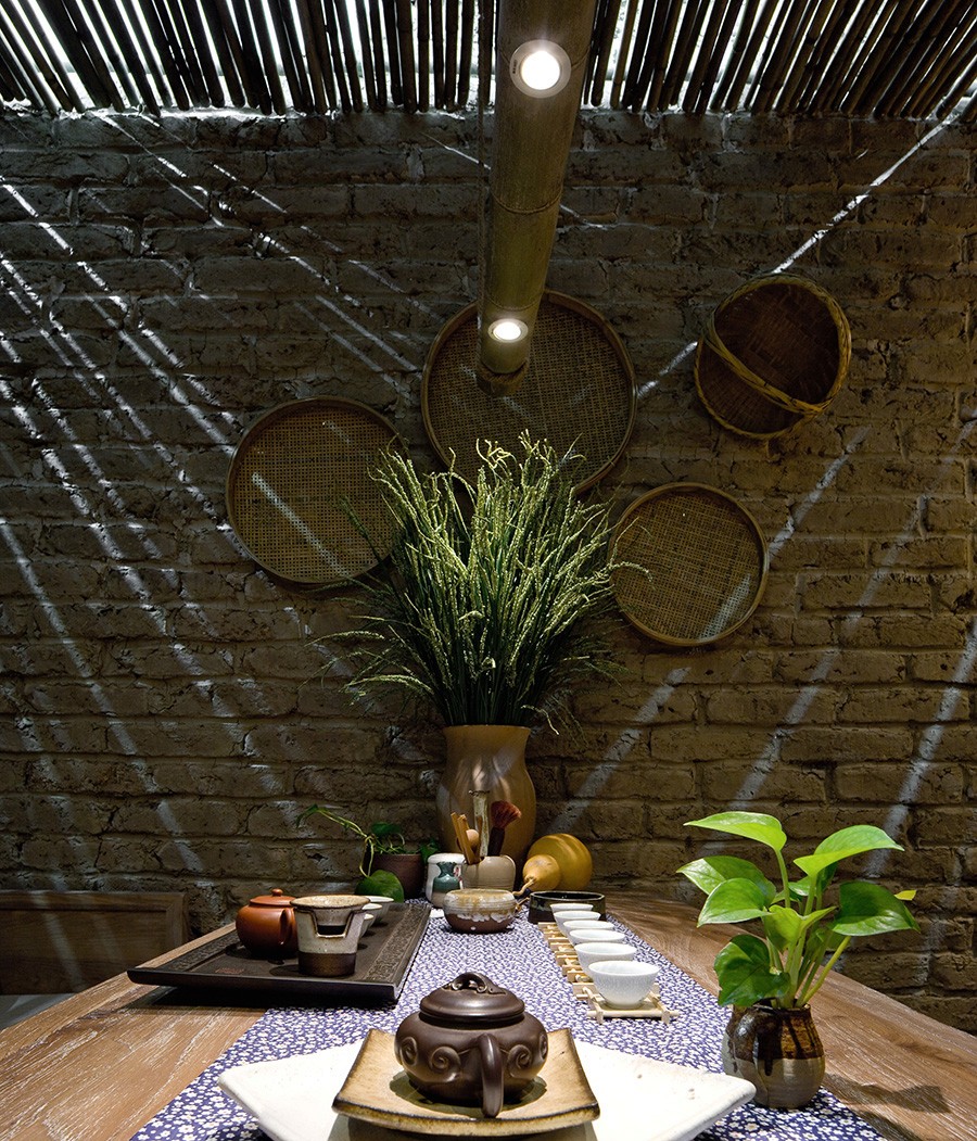 俗話說,一茶一人生。從“敘品茶事”四個字可以讀出其中的含義——敘:講述,敘舊。品:品味,琢磨。茶:煮茶,吃茶。事:一些感慨經歷,人生百事。只看這四個字,已經感受到了一些關于茶的情懷。這樣一個需要細細品茶,慢慢享受時光的空間,自然需要原汁原味的設計。我們用竹、瓦、土這三種來自于農村自然的材料。整個色調是舊舊的黃色,暗暗的紅色。