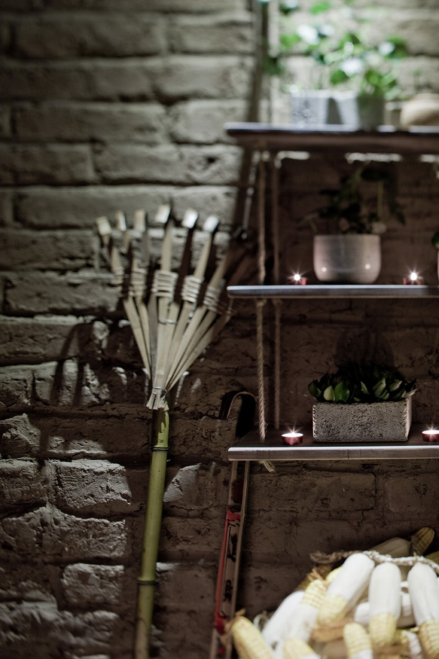 過道盡頭是接待臺。用粗獷的山石材料做成,頂上一條竹扁擔做成的吊燈,別有一番意味,有趣又實用。通往洗手間的過道地上放了幾個竹編的裝飾燈,圓乎乎的造型,憨態可掬。燈光透過竹編的縫隙照在墻上、地上,烘托了暖暖的氣氛。