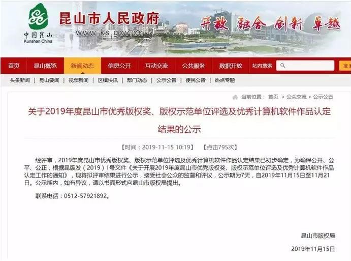 - 2019-11-25 13:32:13 恭喜敘品獲評昆山市版權示范單位(附公示文件)